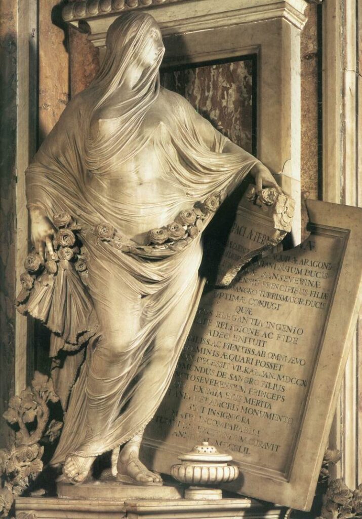 Ali vratimo se umetničkim delima. Ona svedoče ne o večnosti tela, nego o trijumfu duha. I umetnosti. Za jednu od najčuvenijih skulptura, ,,Pokrivenog Hrista” ili ,,Hrista pod velom” Đuzepa Sanmartina, delu tako veličanstvene izrade, vezuju se takođe brojne legende. Čuveni venecijanski majstor Antoio Kanova (1757-1822) ponavljao je da bi dao bar deset godina sopstvenog života da je on bio taj koji je isklesao Hrista na odru, a ne Đuzepe Sanmartino (1720-1793). Delo je započeo Antonio Koradini, autor skupture ,,Skromnost” (uspomena na rano preminulu prinčevu majku) iz iste kapele. Još jedan veo koji izgleda kao tkanina, a ne kao mermer. Legenda o skulpturi Hrista govori da je veo nekada zaista bio od tkanine, ali da ga je princ uz pomoć alhemičarskih tajni pretvorio u mermer! I tako redom. Lepota koja ostaje neopisiva. I osećanje straha i uznemirenosti.