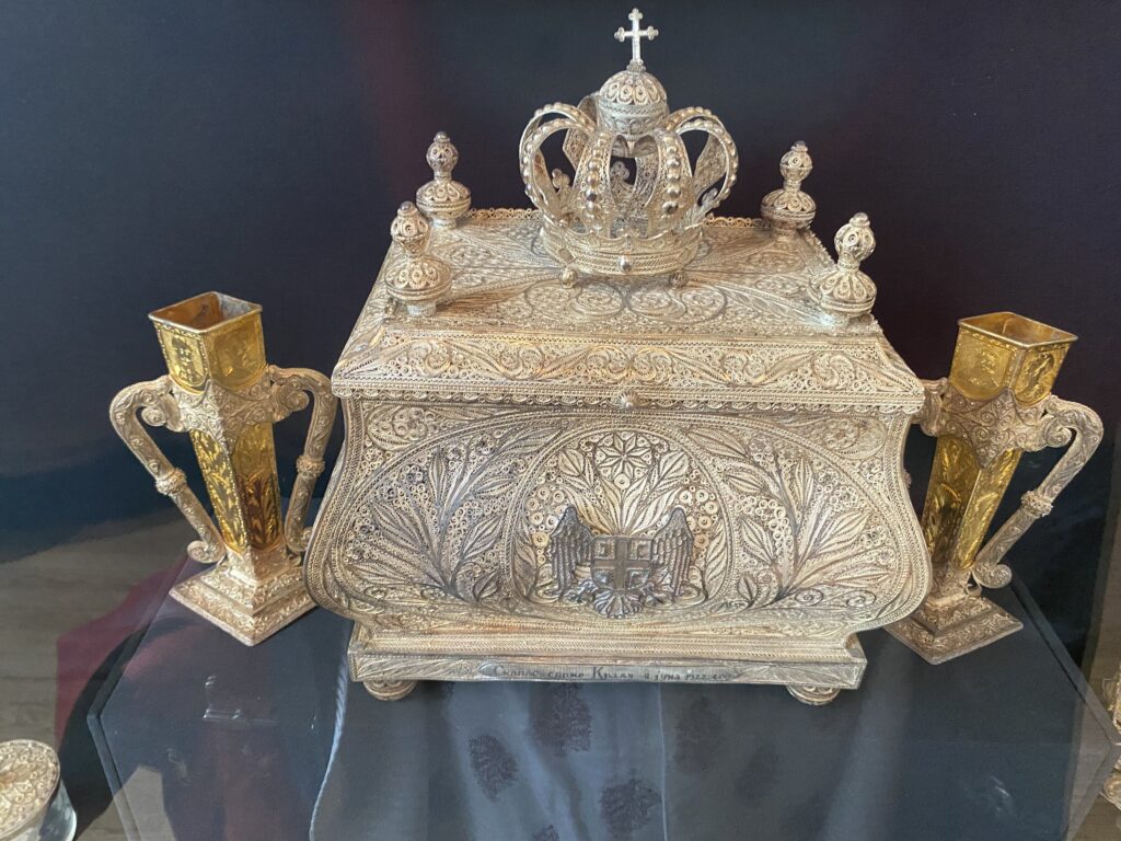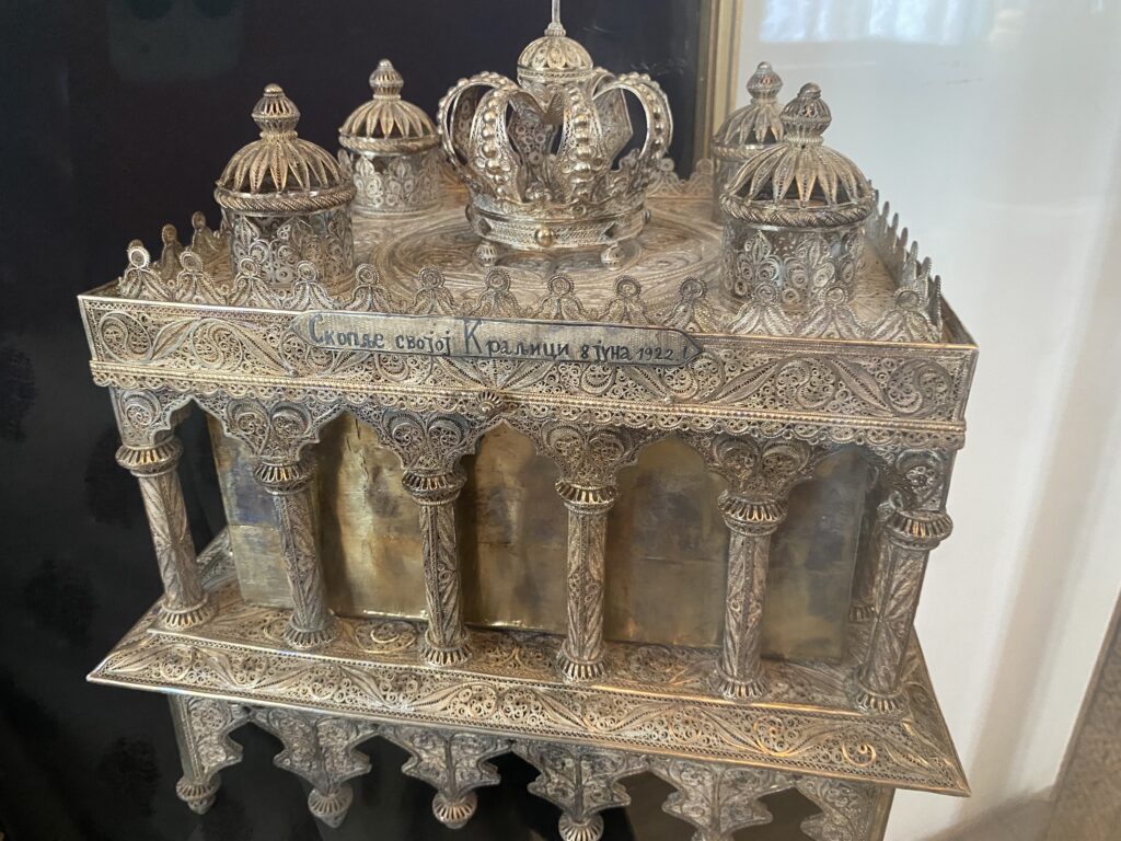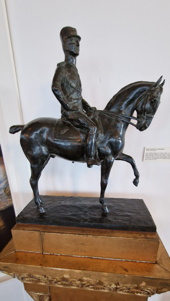 Mala statua koja predstavlja kralja Aleksandra Karađorđevića na konju, izrađena je u bronzi početkom 1900. godine. Autor je nepoznat. Najzad, između ostalih predmeta, izloženi su i pokloni, predmeti u srmi i zlatu koje je mladi kraljevski par dobio za svadbu u junu 1922. godine. Skoplje svojoj Kraljici, Kralju, Narod i činovnici Kosova i Kralju i Kraljici, 1922. godine…